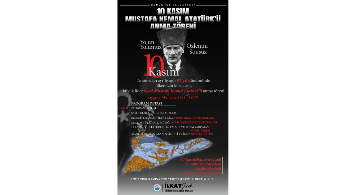 Menderes Belediye Başkanı İlkay Çiçek, “Atatürk’ü özlüyor, hiçbir zaman unutmuyoruz. Onun fikirlerini yaşatmak ve mirasına sahip çıkmak için gösterdiği hedefe yürüyerek gelecek nesillere aktarıyoruz. Etkinliklerimizle Ata’mızı resim, şiir ve koreografilerle anacağız. Tüm vatandaşlarımızı saygı ve sevgi gösterimize bekliyoruz.” dedi.