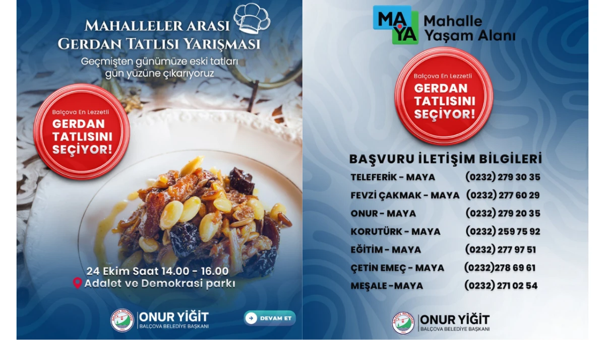 Balçova Belediyesi, “Geçmişten Günümüze Unutulan Lezzetleri Gün Yüzüne Çıkarıyoruz” sloganıyla, geleneksel tatları yaşatmayı amaçlayan Gerdan Tatlısı Yarışması düzenliyor. Etkinlik 24 Ekim 2025 Cuma günü 14.00-16.00 saatleri arasında Adalet ve Demokrasi Parkı’nda gerçekleşecek.