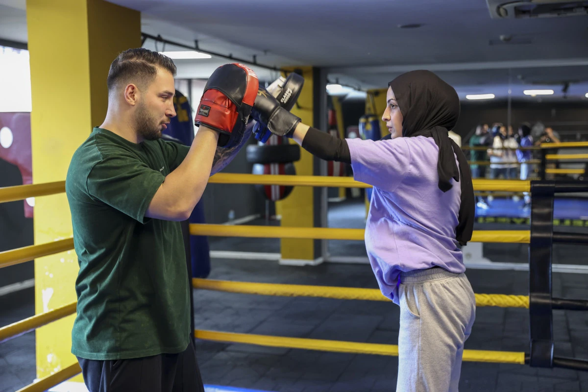 Uzman eğitmenler eşliğinde verilen kick boks derslerinde, kadınlar kondisyonlarını artırıyor ve olası şiddet durumlarında kendilerini nasıl koruyacaklarını öğreniyor.