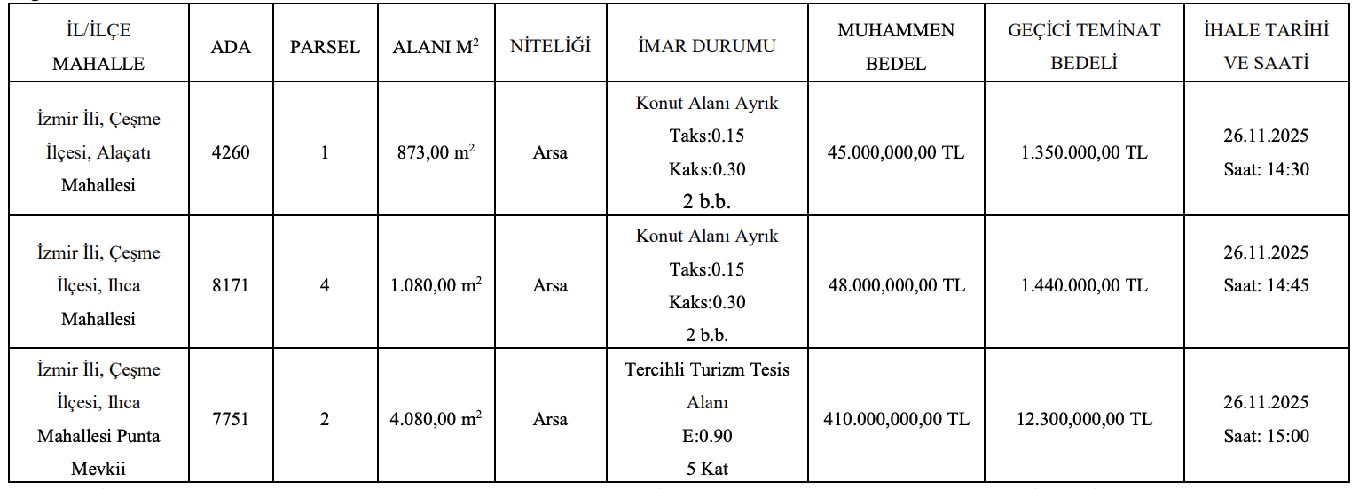 Satışların gerçekleşmesiyle belediye kasasına en az 503 milyon TL girmesi öngörülüyor. İhaleler 26 Kasım 2025 tarihinde saat 14.30’da başlayacak, 15 dakikalık aralıklarla devam ederek saat 15.00’te sona erecek.