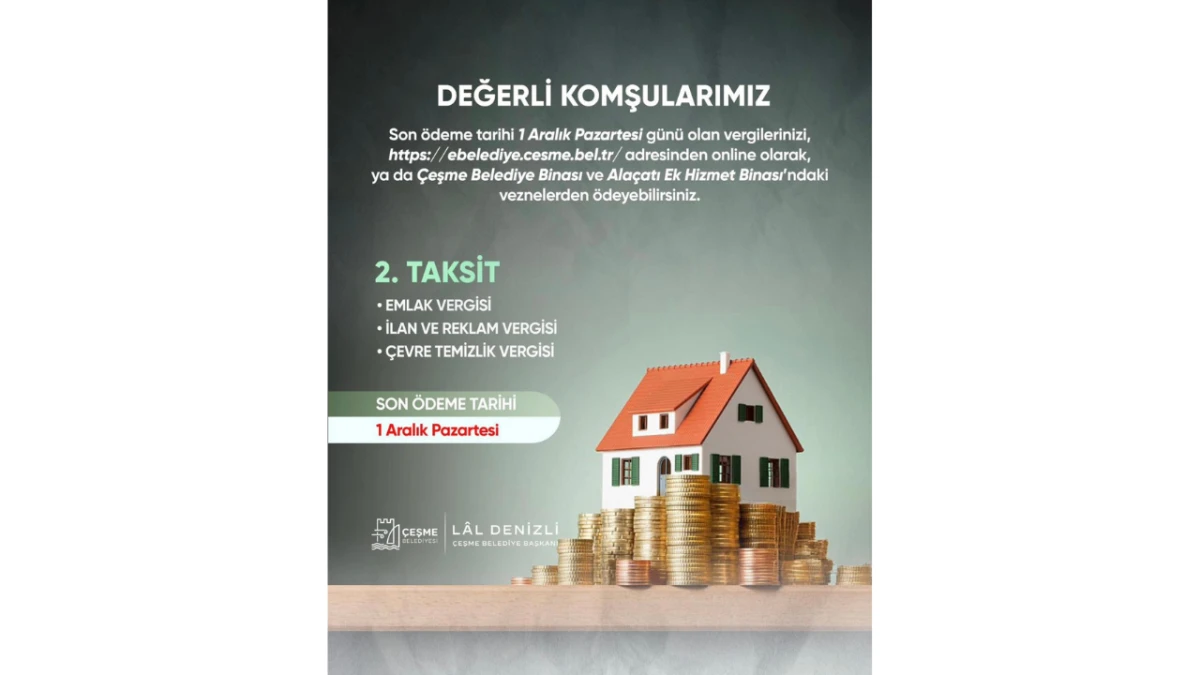 Çeşme Belediyesi, emlak, ilan-reklam ve çevre temizlik vergilerinin ikinci taksit ödemeleri için son tarihin 1 Aralık Pazartesi olduğunu duyurdu