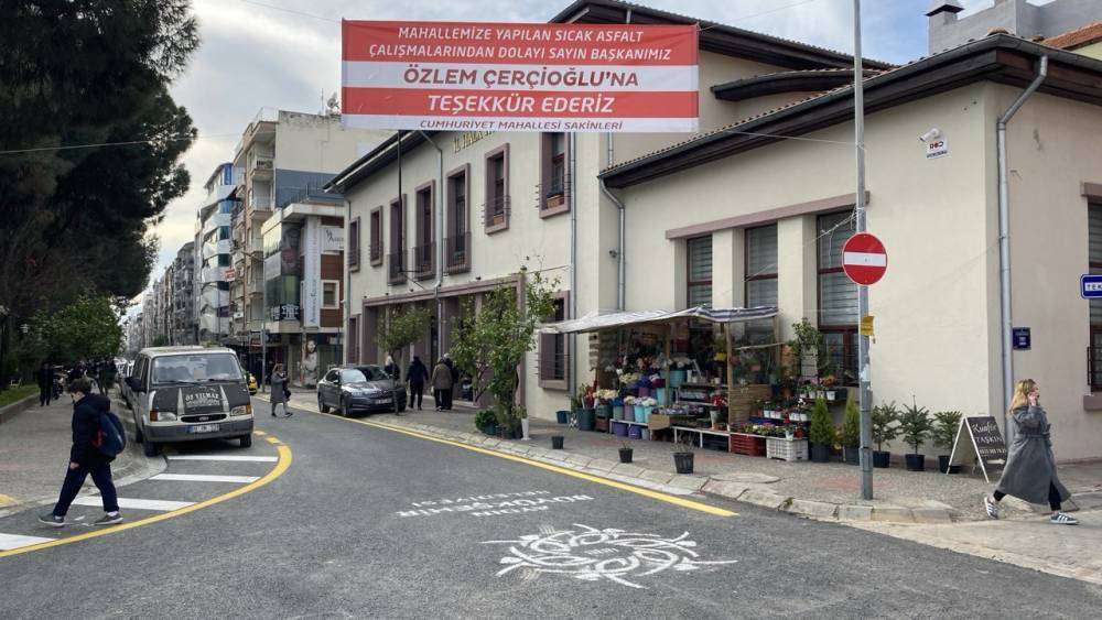 Adnan Menderes Bulvarı’ndan Cumhuriyet Caddesi girişinde yer alan ve Cumhuriyet Mahallesi sakinlerinin imzasını taşıyan pankartta, "Mahallemizde yapılan sıcak asfalt çalışmalarından dolayı sayın başkanımız Özlem Çerçioğlu’n teşekkür ederiz" ifadelerine yer verildi.
