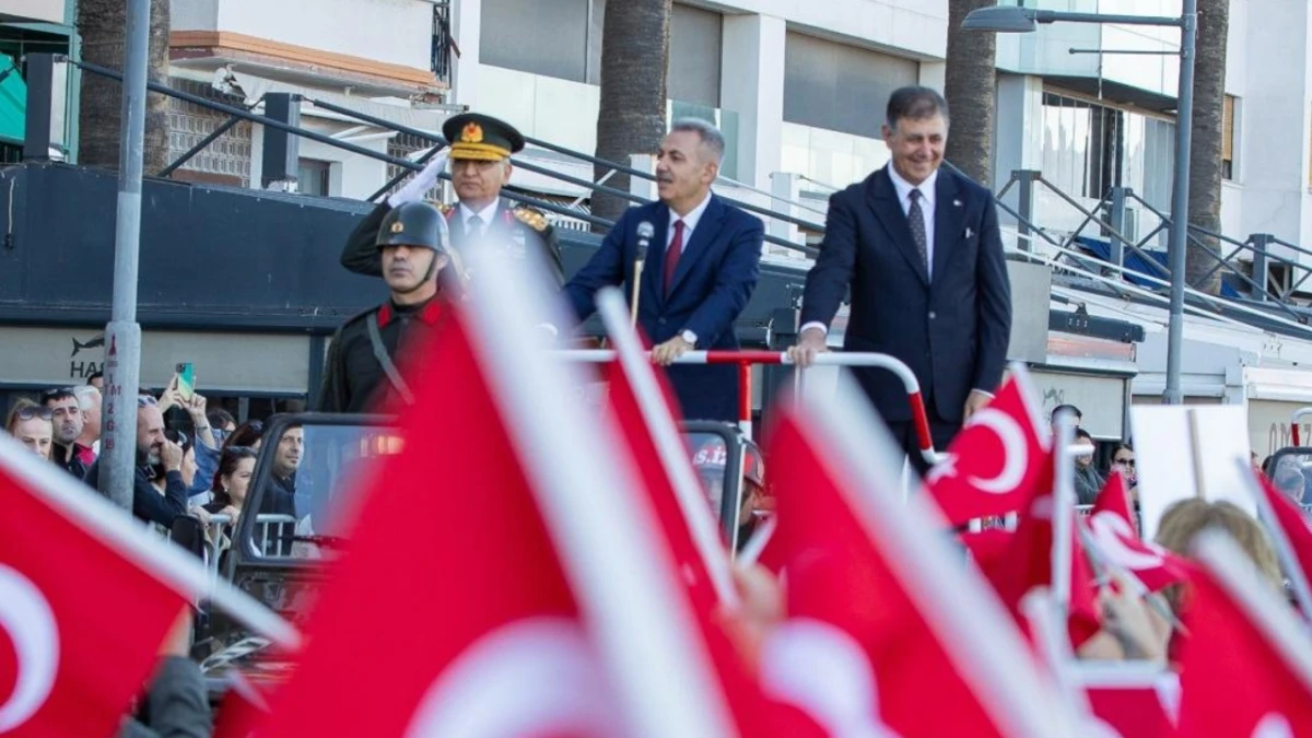 Protokol üyeleri askeri araçla tören birliklerini ve vatandaşları selamlayarak Cumhuriyet Bayramı’nı kutladı.