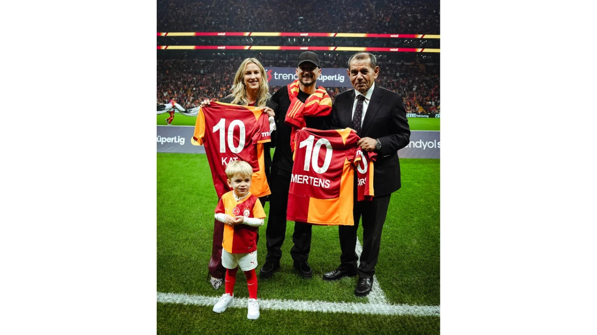 Dries Mertens, maç öncesi Başkan Dursun Özbek tarafından kendisine hediye edilen “10 numaralı forma” ile onurlandırıldı. Eşi Katrin Kerkhofs ve oğlu Ciro ile birlikte tribünlerde yer alan Belçikalı yıldız, taraftarların sevgisiyle karşılandı: