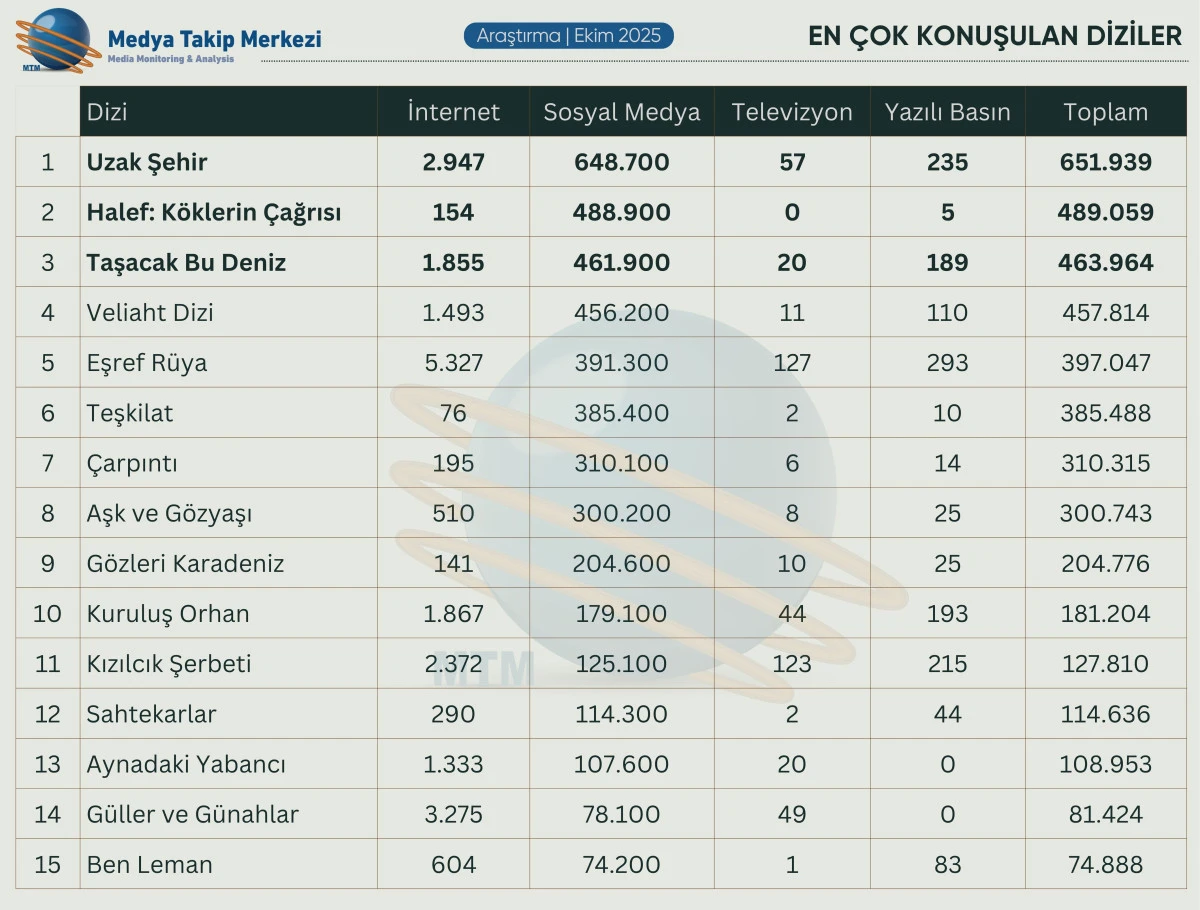 MTM Medya Takip Merkezi, Ekim 2025’te medya ve sosyal medyada en çok konuşulan dizileri araştırdı. Rapora göre; geleneksel medyada Eşref Rüya, sosyal medyada ise Uzak Şehir zirvede yer alırken, ayın öne çıkan yapımları ise Halef: Köklerin Çağrısı ve Taşacak Bu Deniz oldu