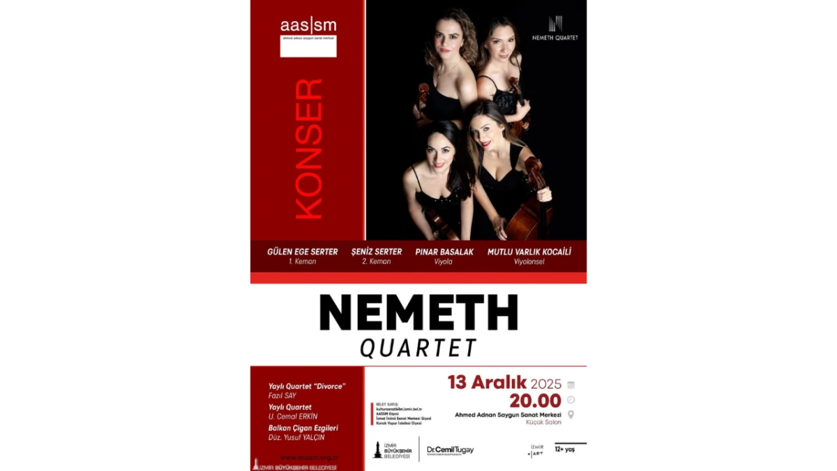 13 Aralık’ta Nemeth Quartet, Küçük Salon’da saat 20.00’de konser verecek. Grup, kurucuları Istvan ve Katalin Nemeth’e adanmış repertuarı ile sahnede olacak. Biletler kultursanatbilet.izmir.bel.tr üzerinden satışta.