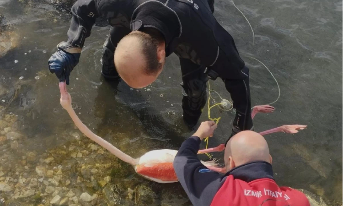 İnciraltı Kent Ormanı’nda deniz kenarında mahsur kalan flamingonun ayağına ip dolandığı ihbarı üzerine harekete geçen İzmir İtfaiyesi dalgıçları, yaklaşık 15 dakika süren bir çalışma ile ipleri güvenli şekilde çıkardı. Ekipler, flamingonun herhangi bir yara veya sağlık sorunu yaşamaması için dikkatli bir müdahale gerçekleştirdi.