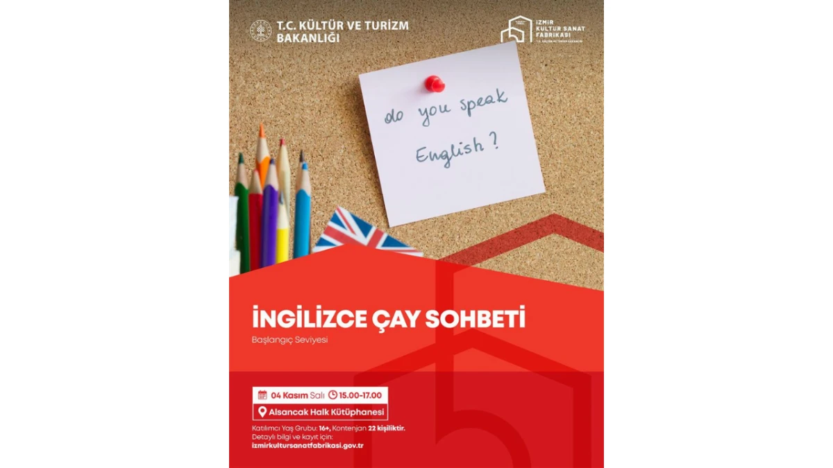 Kültür ve Turizm Bakanlığı İzmir İl Müdürlüğü, haftalık etkinlik takvimi açıkladı. Takvimde öne çıkan önemli etkinliklerde biri olan İngilizce Çay Sohbeti, pratik yapmak isteyen kişiler için önemli bir fırsat olarak değerlendiriliyor