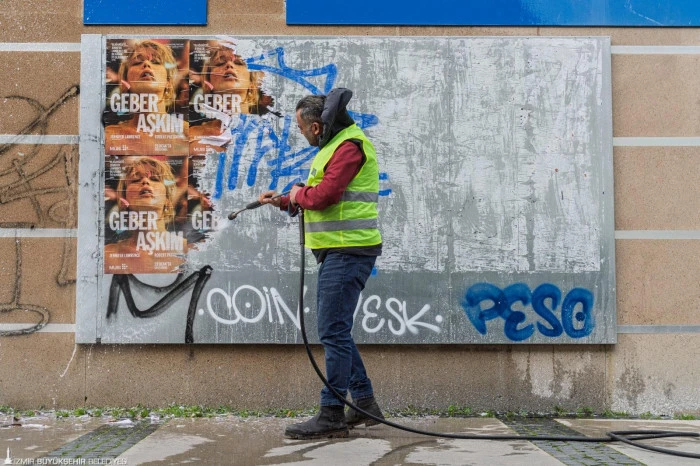 İzmir Büyükşehir Belediyesi İlan ve Reklam Yönetmeliği’ne aykırı olduğu tespit edilen afişler kaldırılırken, aynı zamanda temizlik çalışmaları da eş zamanlı olarak yapılıyor.