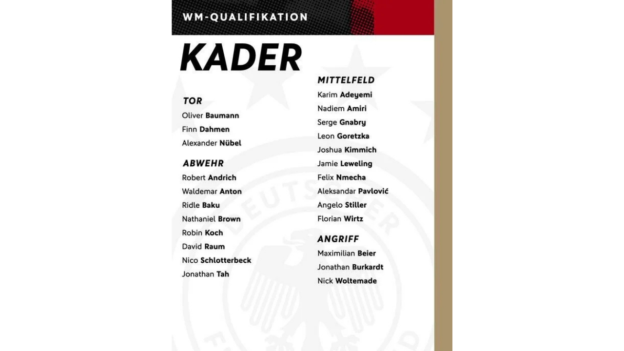 Milli takımın kadrosu, teknik direktör Hans-Dieter Flick yönetiminde belirlenen isimlerden oluşuyor.