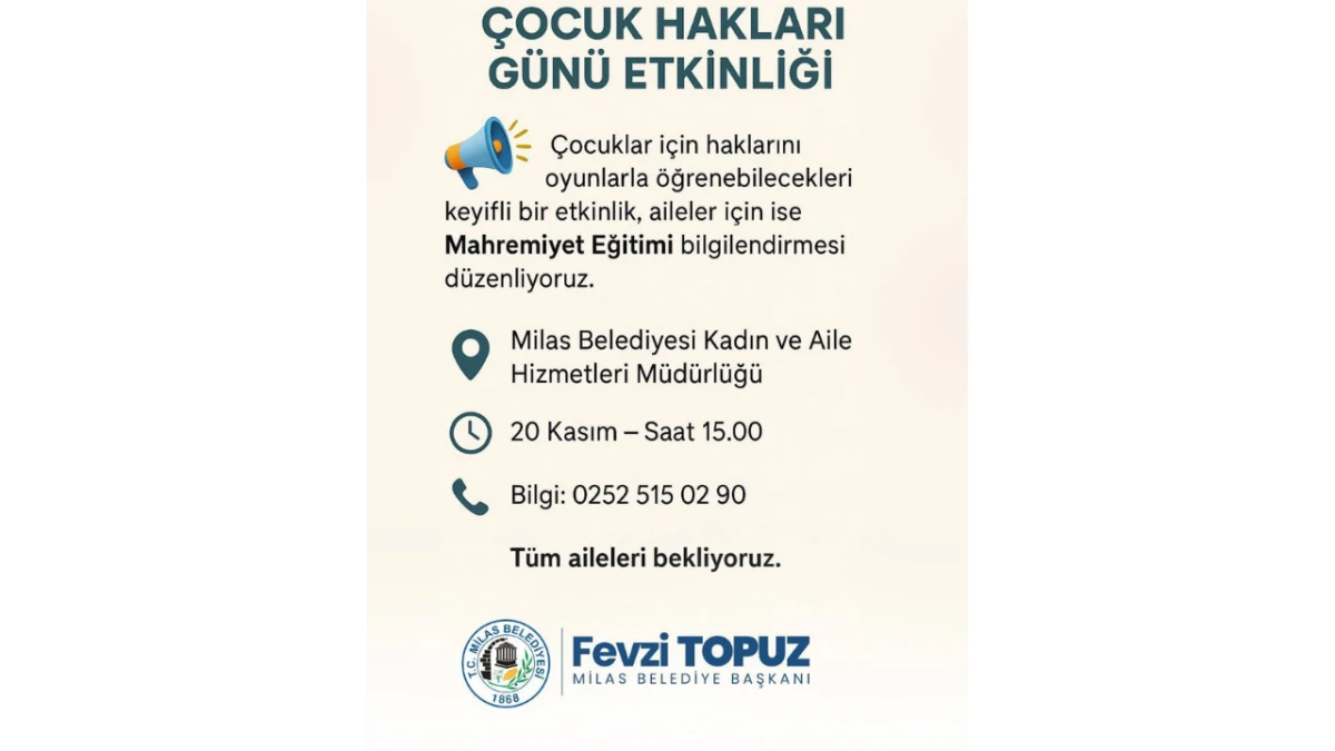 Milas Belediyesi Sosyal Yaşam Merkezi’nde düzenlenecek Çocuk Hakları Günü Etkinliği 20 Kasım 2025 Perşembe günü saat 15.00’de başlayacak. Etkinlikler hakkında detaylı bilgi almak isteyenler (0252) 515 02 90 numaralı telefonu arayabilecek. Düzenlenecek etkinliğe tüm aileler davet edildi.