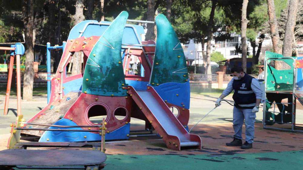 Atatürk ve 23 Nisan Parkı’ndan başlayan çalışmalar, belediye ekipleri tarafından titizlikle yürütülerek ilçedeki tüm oyun grupları dezenfekte edilecek.