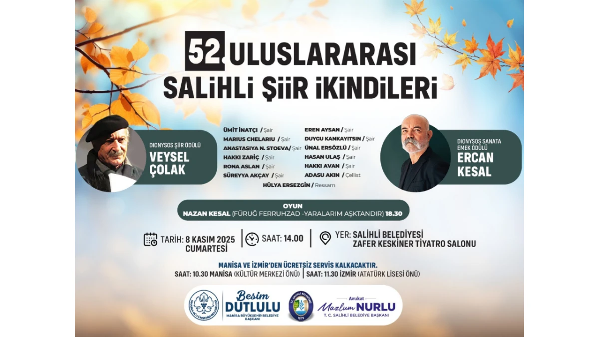 Manisa Büyükşehir Belediyesi ve Salihli Belediyesi iş birliğiyle düzenlenen Salihli Şiir İkindileri, bu yıl 52’nci kez gerçekleştirilecek. Etkinlik kapsamında Dionysos Şiir ve Sanata Emek Ödülleri de sahiplerini bulacak.