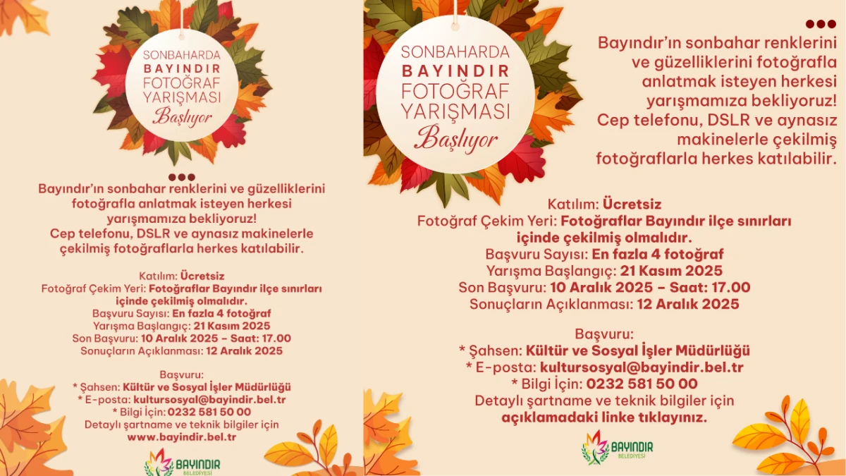 Bayındır Belediyesi, ilçenin sonbahar güzelliklerini fotoğraf karelerine taşımak amacıyla “Sonbaharda Bayındır” Fotoğraf Yarışmasını başlattı. Tüm vatandaşların katılımına açık olan yarışmada her katılımcı, Bayındır’ın doğal dokusunu yansıtan fotoğraflarla başvuru yapabilecek.