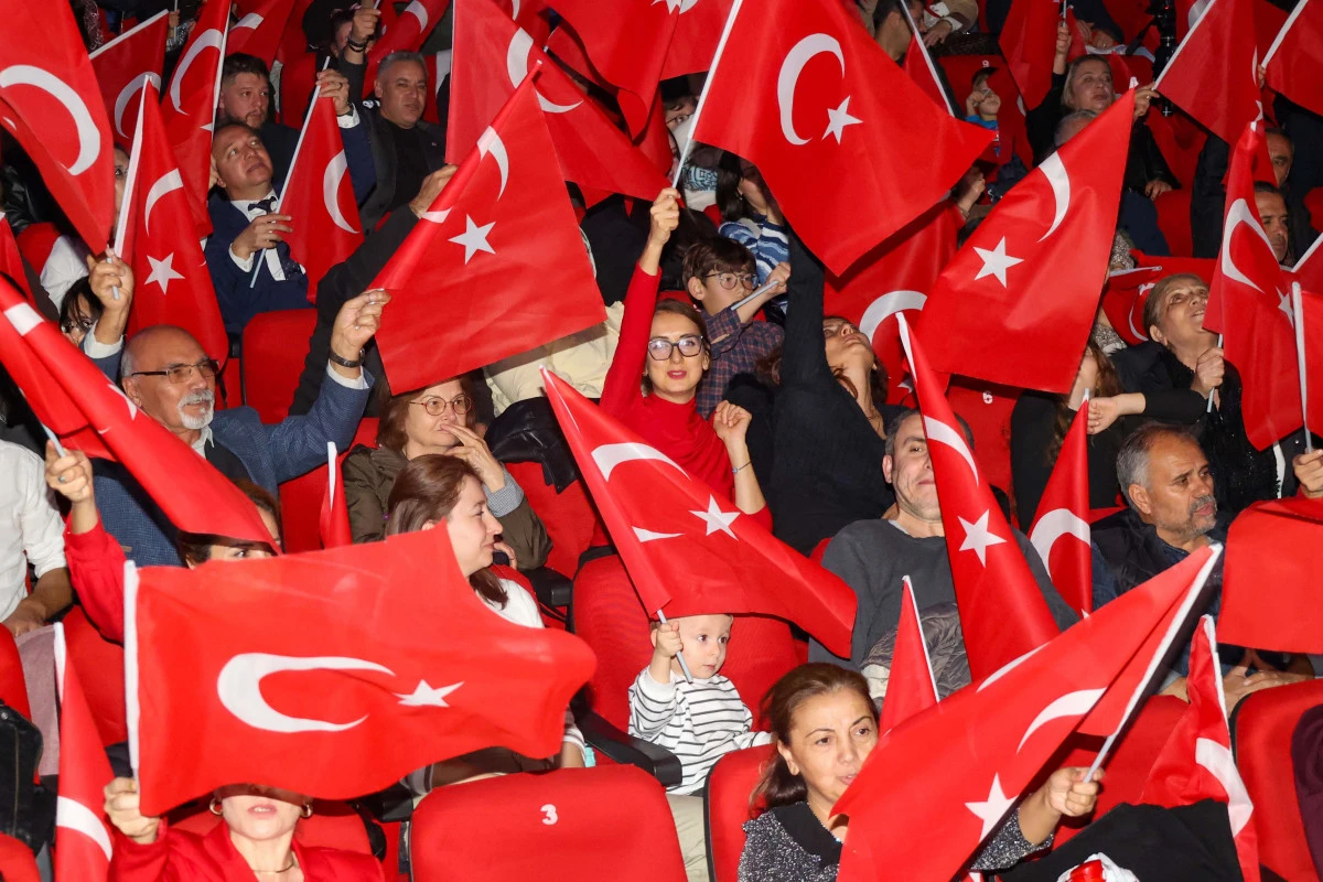 Salonun tamamen dolduğu programda, yüzlerce kişi marşlara hep birlikte eşlik ederek unutulmaz bir atmosfer oluşturdu.